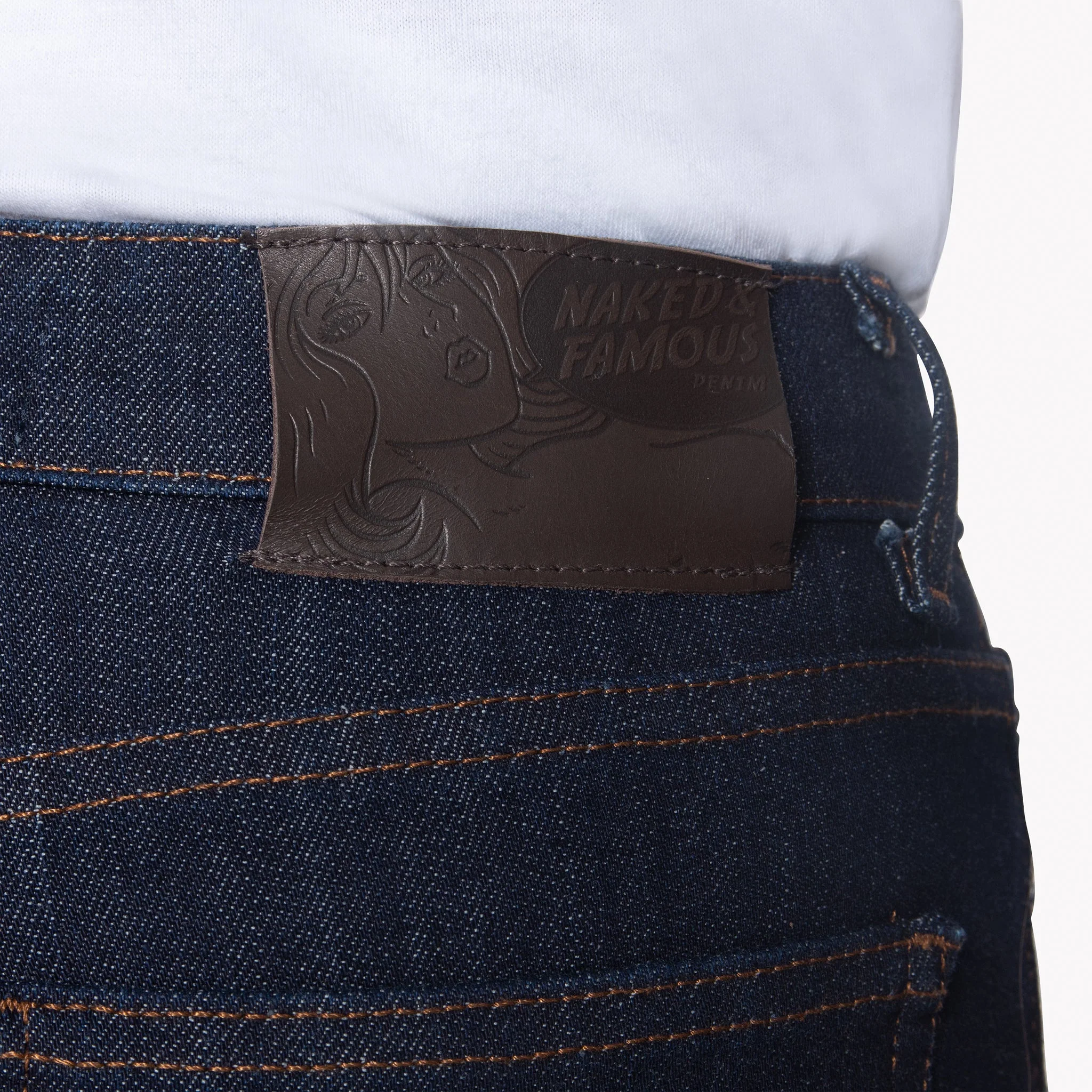 The Indigo Power Stretch is a 12oz indigo Japanese denim, woven in a right hand twill construction. The denim is dyed indigo on the warp and white on the weft for a classic look. The dye is designed to fade with prolonged wear. The denim is made with 5% stretch for increased comfort, and has an incredible stretch recovery performance allowing the jeans to snap back to shape wear after wear. Other details include contrast stitching, brown leather patch, silver metallic waist button and rivets. The Skinny is a skinny fit; medium rise, tight throughout with a small leg opening.