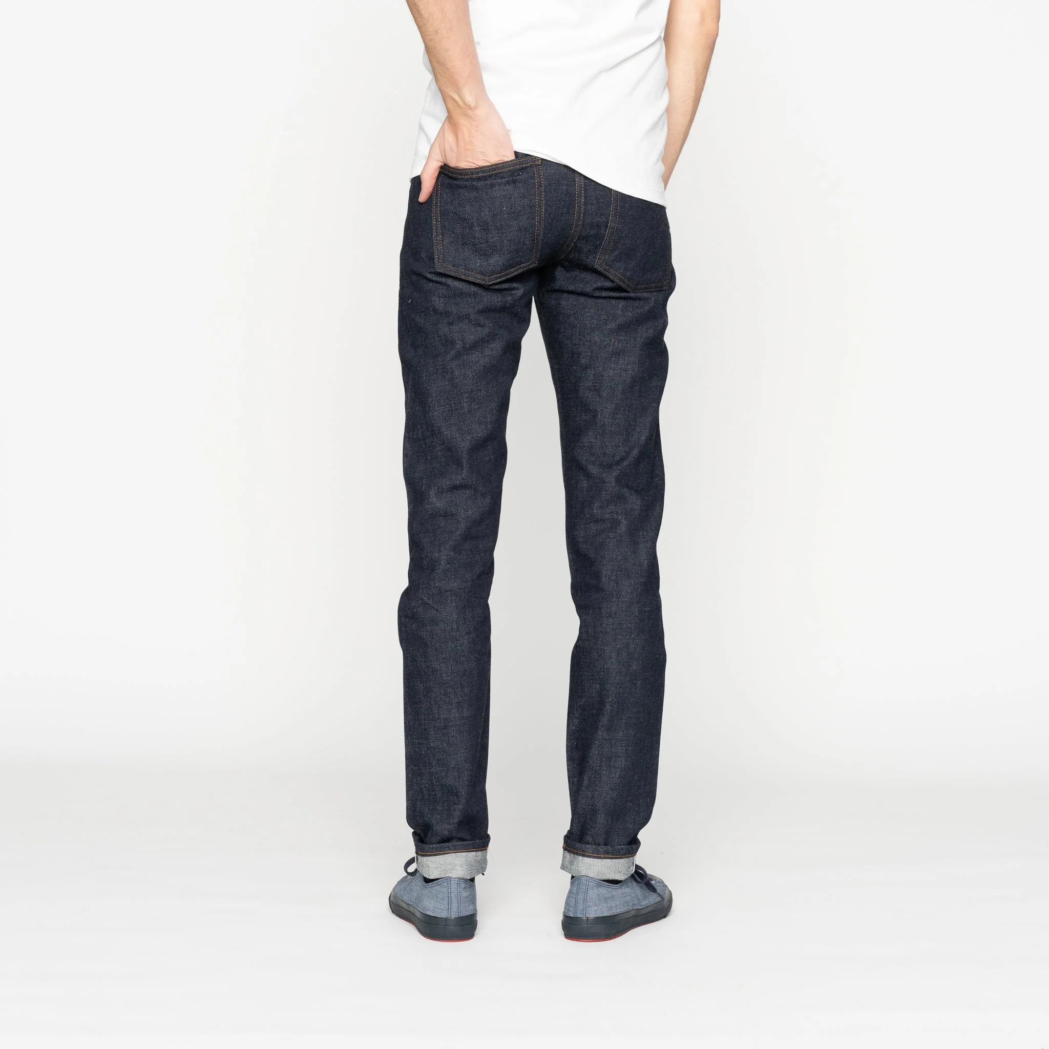 The Super Guy is a skinny fit with a medium rise, a slim top block, and a taper from knee to hem.